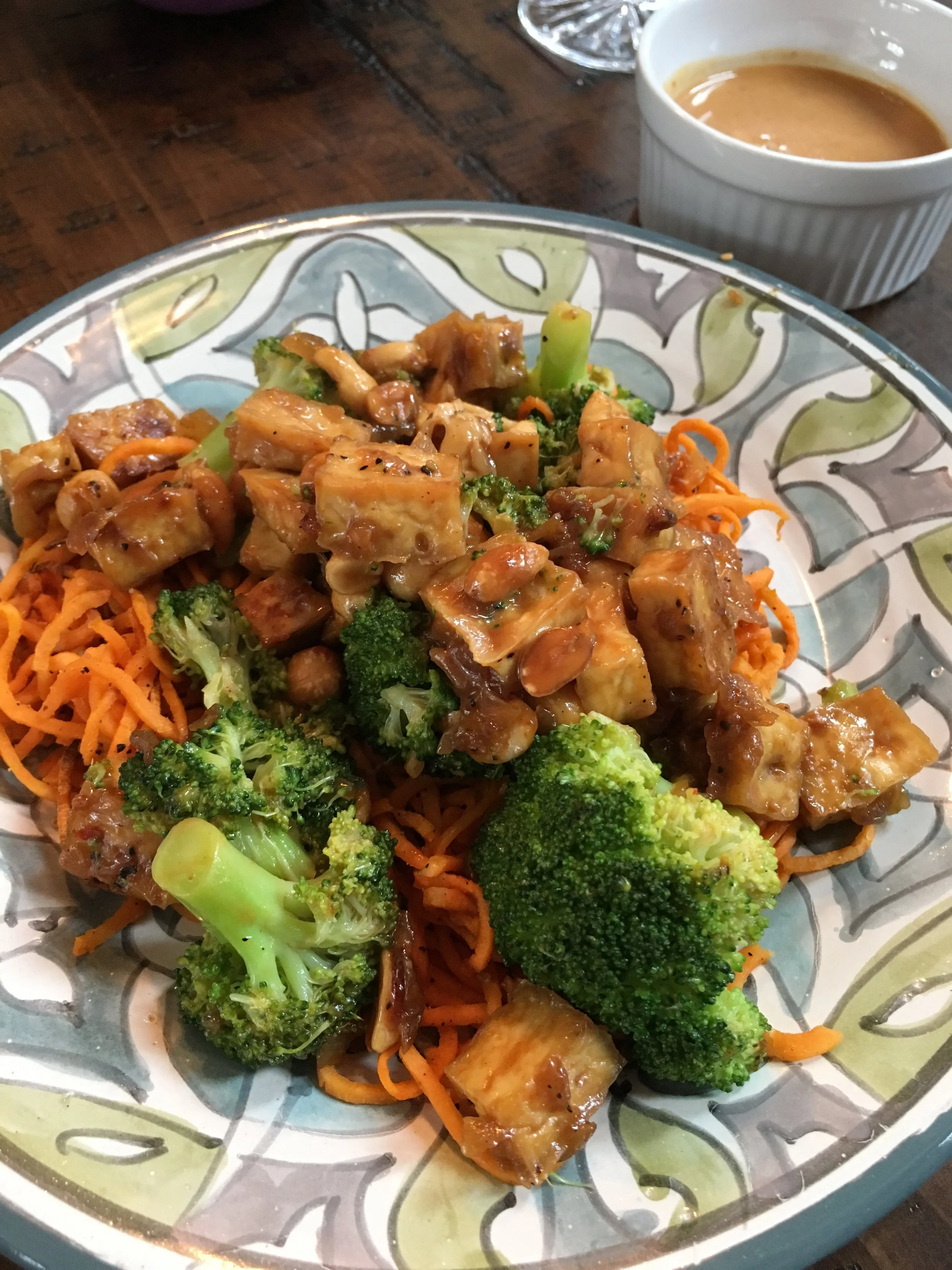 Coconut Peanut Tofu & Broccoli on Spiralized Sweet Potato Noodles