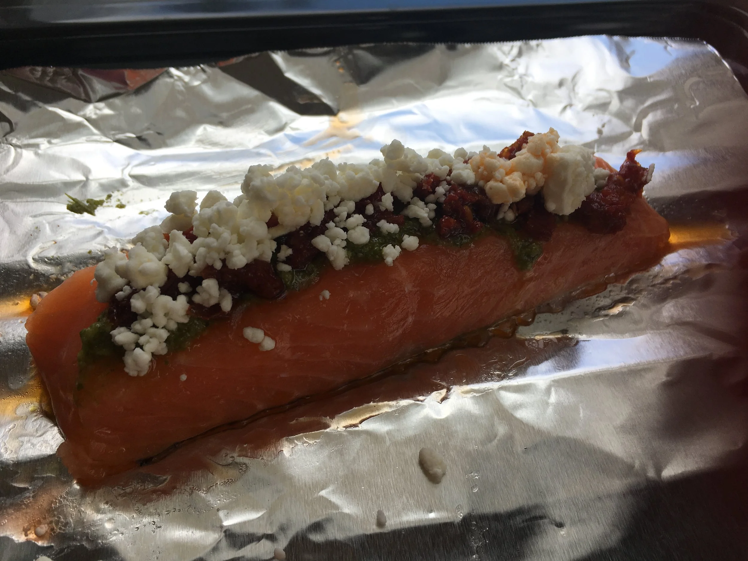 Norwegian Salmon with Pesto, Sun-dried Tomatoes, and Feta