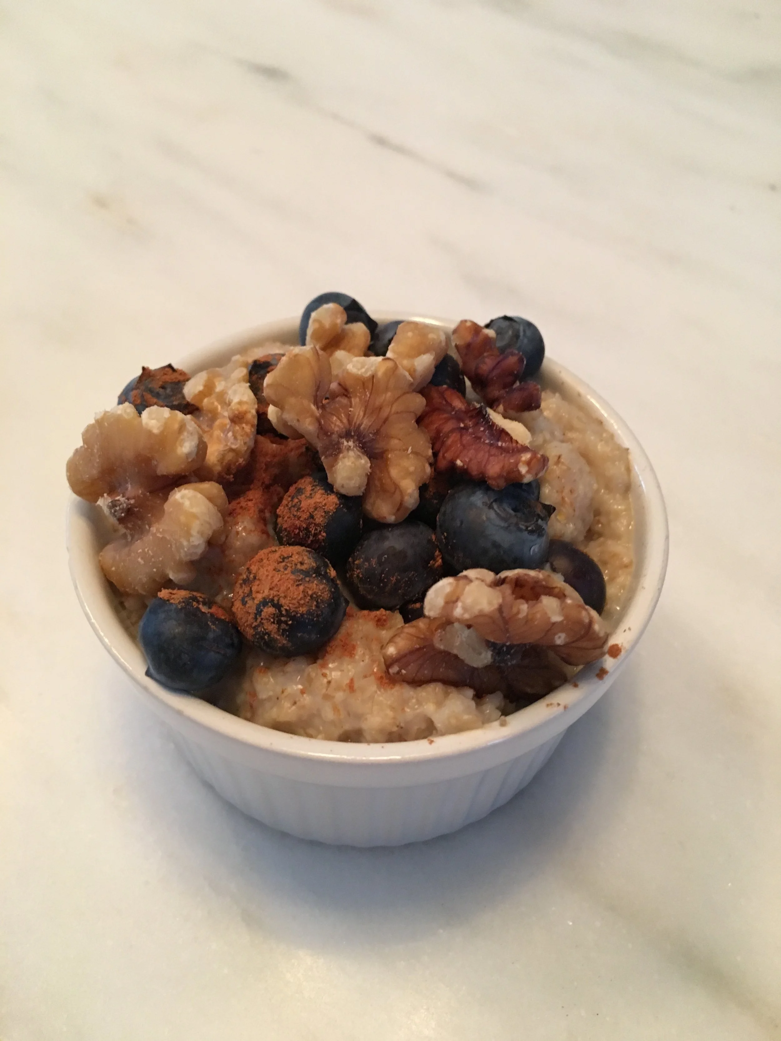 Add 6 oz of plant-based milk to protein powder; shake vigorously. Add cinnamon, chia seeds, walnuts, almond butter and oat bran. Shake gently and store overnight in refrigerator. Heat in microwave for 1 minute on reduced power; stir. Heat an additional 30 seconds or until desired temperature. Enjoy!