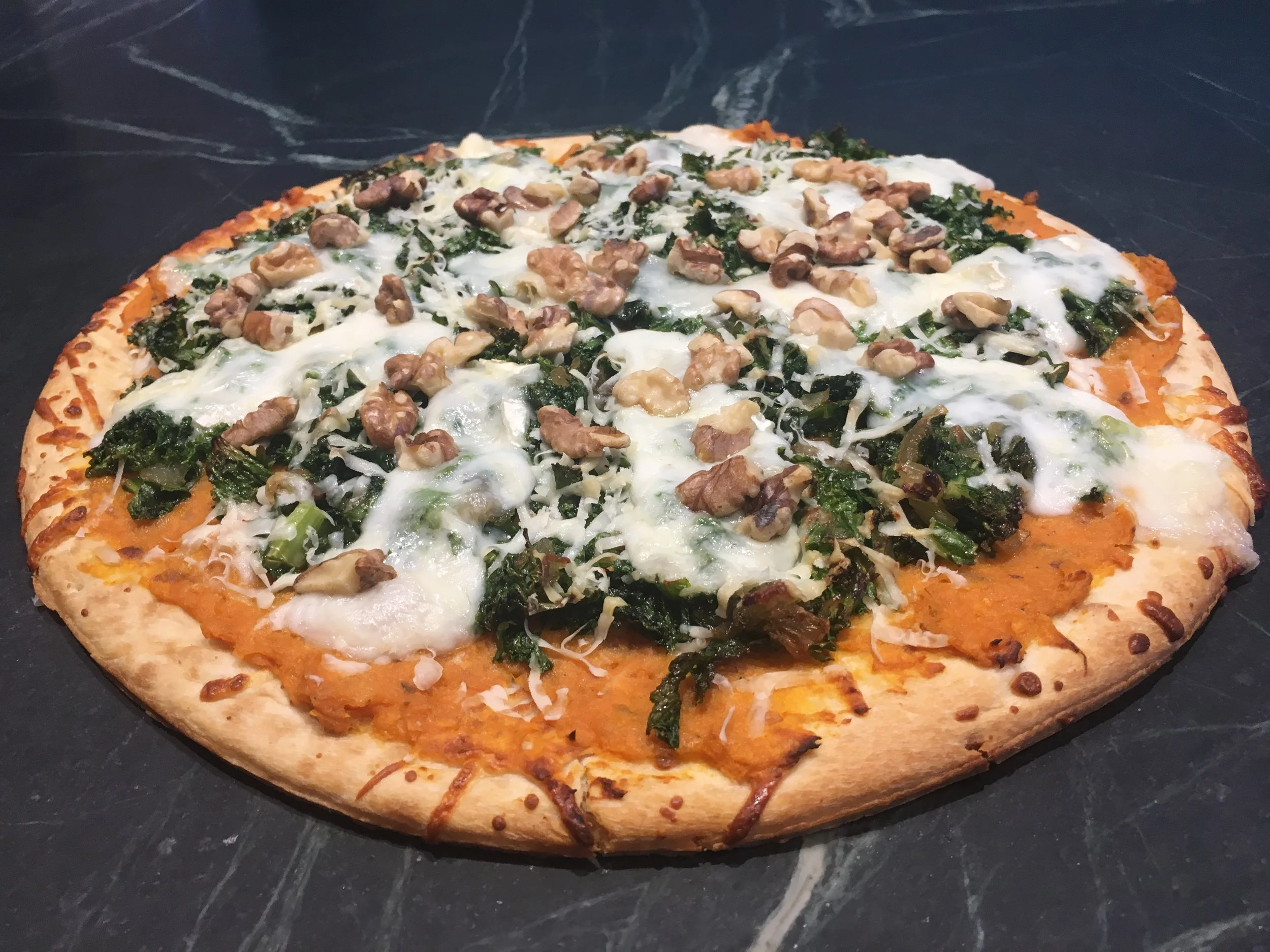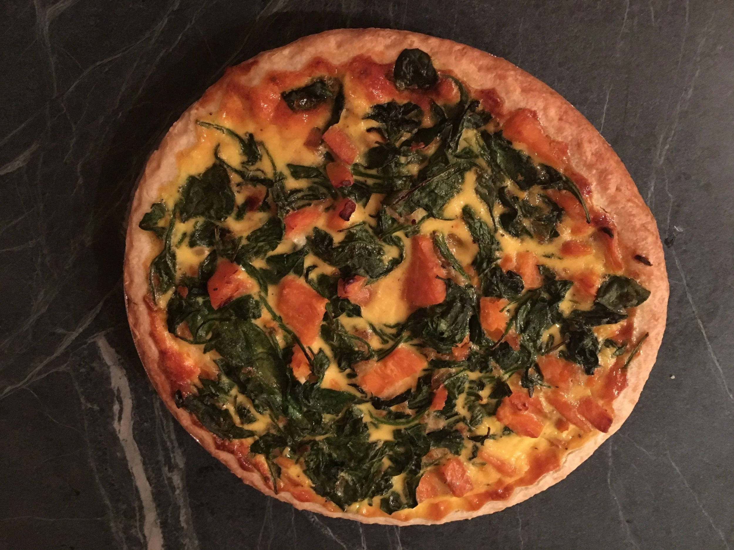 Place roasted sweet potato/squash into prepared pie shell, add spinach, and top with egg mixture. Place quiche on baking sheet and bake on middle shelf in preheated 375 F oven for 40 minutes. If using a convection oven, decrease temperature to 350F and reduce cook time. The top will be golden brown and the center of the quiche set. Remove from oven and allow to stand on wire rack for 10 minutes.