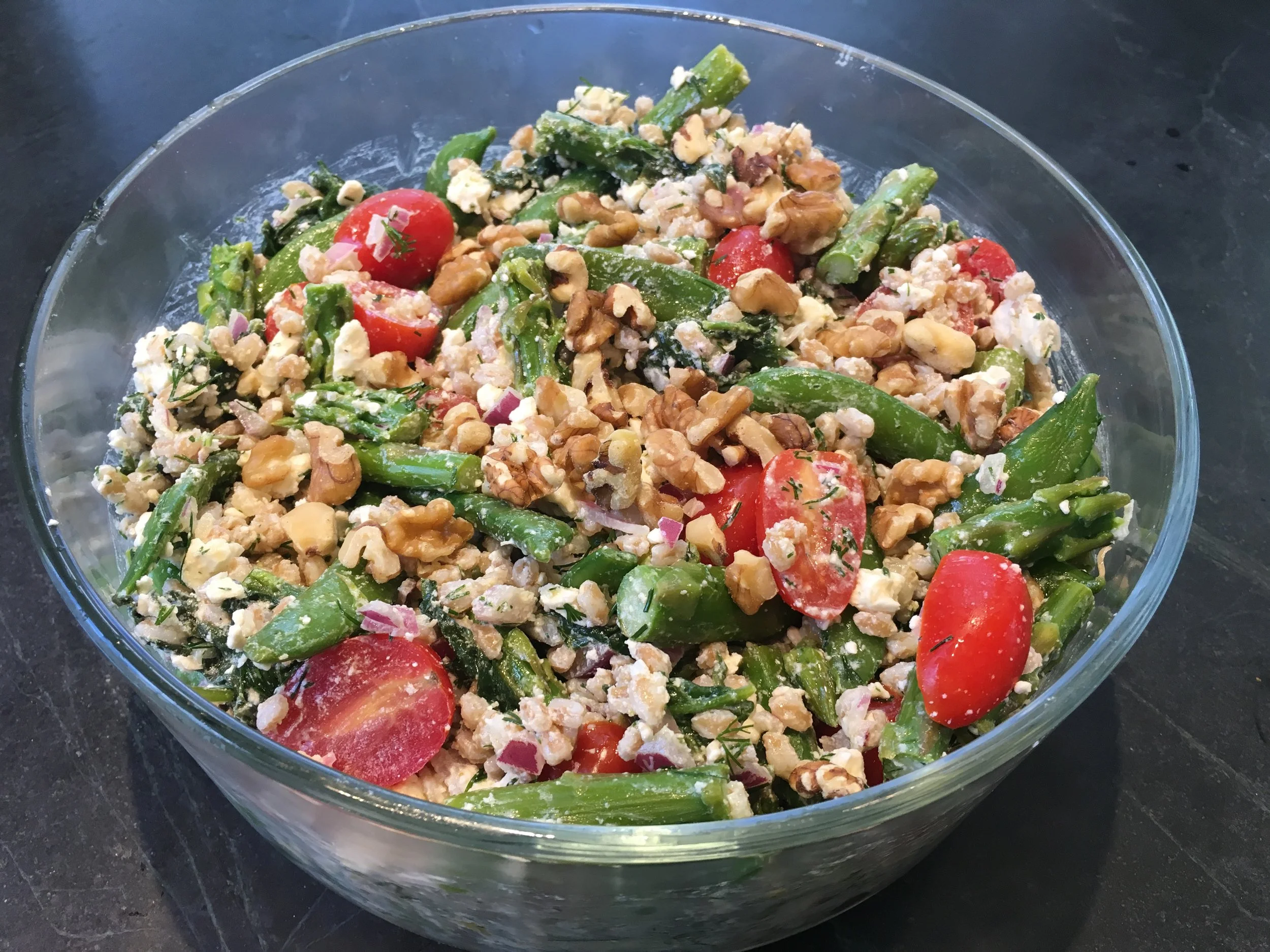 Fresh basil, walnuts, shaved parm cheese, cracked pepper, garlic, pink sea salt. All goes into a food processor.