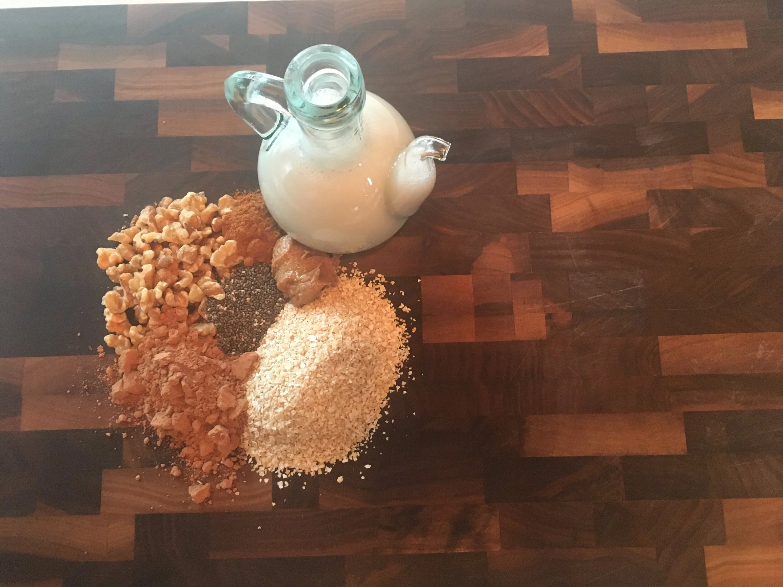 INGREDIENTS: ALMOND BREEZE UNSWEETENED VANILLA ALMOND MILK, WHEY PROTEIN ISOLATE, OAT BRAN, WALNUTS, FRESH GROUND ALMOND BUTTER, CHIA SEEDS, CINNAMON